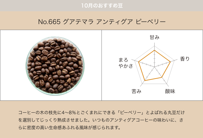 【10月のおすすめ豆】 10月にご紹介するビーンズは、「グアテマラ アンティグア ピーベリー」です。 コーヒーボーイの販売するシングルビーンズのなかでも人気の高い「グアテマラ アンティグア」。 その中でも収穫の際にコーヒーの木の枝先に4~8%とごくまれにできる「ピーベリー」とよばれる丸豆だけを選別し、気温の変化の少ない木造倉庫の中でじっくり熟成しました。 いつものアンティグアコーヒーの味わいに、さらに密度の高い生命感あふれる風味が加わりました。不思議と元気が湧き出てくるような活力ある一杯を、ぜひ体験してください! 〈グアテマラ アンティグア ピーベリー〉 プロダクトナンバー:No.665 生産国:6 中米・グアテマラ 焙煎度:6 シティロースト/NYで好まれたことから名付けられた鮮やかなコーヒーブラウン 濃厚感:5 ミルキィな 精製方法 :伝統的な水洗方式・天日乾燥 価格:1598円(税込)/ 100g プロダクトナンバーとは? コーヒーボーイでは豆の特性を3ケタの数字で表しています。 お気に入りの豆のナンバーをチェックすると、あなたのお好みがわかりますよ! 100のケタは原産国を表しています。 10のケタは焙煎の深さを表しています。 1のケタは濃厚感の強さを表しています。