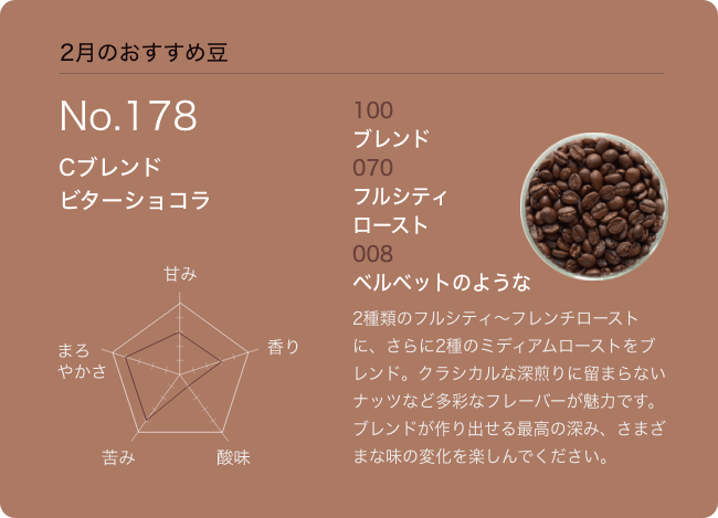 2月にご紹介するビーンズは、「コーヒーボーイブレンド ビターショコラ」です。 このブレンドのキーワードは”神戸”。 明治時代の初期から海外に向けての玄関口として栄えた神戸は、コーヒーの街として古くから親しまれてきた大変重要な地区です。 そのコーヒーの街神戸で、 多くの人々から長年愛されてきた古のコーヒーのテイストを再現するというところから このブレンド作製がスタートしました。 タンザニア最高峰キリマンジャロ周辺で収穫された豆と、コロンビア産豆をそれぞれ深煎りレベルまで煎り上げてブレンドの中心とし、さらに中煎りのブラジル産豆とグアテマラ産豆を加えました。 深煎り豆の持つスモーキーな苦味と独特の甘みにベルベットのような口当たりが印象的に感じられ、その後中煎りされた豆の持つ甘さとカカオ感が複雑に混じり合い、 焼き芋やビターチョコレートを連想するテイストが次々と顔を見せてきます。 抽出した後、カップの中で温度が下がるに従って色々なテイストが現れます。 それを発見して楽しんでいただければと思います。 〈コーヒーボーイブレンド ビターショコラ〉 プロダクトナンバー:No.178 生産国:1 ブレンド 焙煎度:7 フルシティロースト/しっかりとしたボディ感と複雑な味わいがあらわれる焙煎 濃厚感:8 ベルベットのような 精製方法 :ナチュラル製法・ウォッシュド製法 価格:780円(税込)/ 100g プロダクトナンバーとは? コーヒーボーイでは豆の特性を3ケタの数字で表しています。 お気に入りの豆のナンバーをチェックすると、あなたのお好みがわかりますよ! 100のケタは原産国を表しています。 10のケタは焙煎の深さを表しています。 1のケタは濃厚感の強さを表しています。