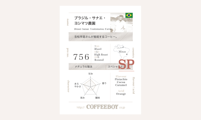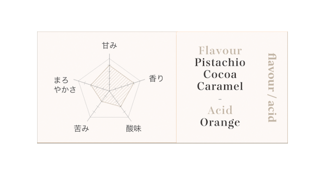 5角形のチャートは豆のキャラクターを表しています。 基本軸は酸味、甘味、苦味です。 一般的には、まろやかさは甘味に比例し、香りは酸味に比例します。 酸味が苦手の方がいらっしゃいますが、指数4までは豆本来の新鮮でフルーティな味わいになり、敬遠せずにトライしてみてください。 指数5は、嗜好的に酸味を好む方向きと言えます。 また酸味、甘味、苦味は焙煎度と深く連動しています。 豆を焙煎し始めると最初に酸味が現れ、次に甘味、苦味、最後に雑味が現れます。 プロダクトナンバーの焙煎度や濃厚感と5味チャートを合わせれば、より細い豆の味わいが見えてきます。 【フレーバーと酸(acid)について】 フレーバーは豆本来が備えている香りや口に含んだ時のテイストです。 主にはフルーツ系、特にベリー系、ナッツ系、チョコレートやキャラメルなどがあります。 注意する点は、焙煎仕立ては、穀物が焼ける時の香ばしさが漂いますが、これは豆本来のフレーバーではなく、豆の澱粉質が焼けた香りです。 本来のフレーバーが薫るのは、焙煎後4〜5日が経過してからになります。 COFFEEBOYのラベルにはたくさんの情報が盛り込まれています。 あなたとコーヒーの新しい出会いの参考にしていただければ幸いです。